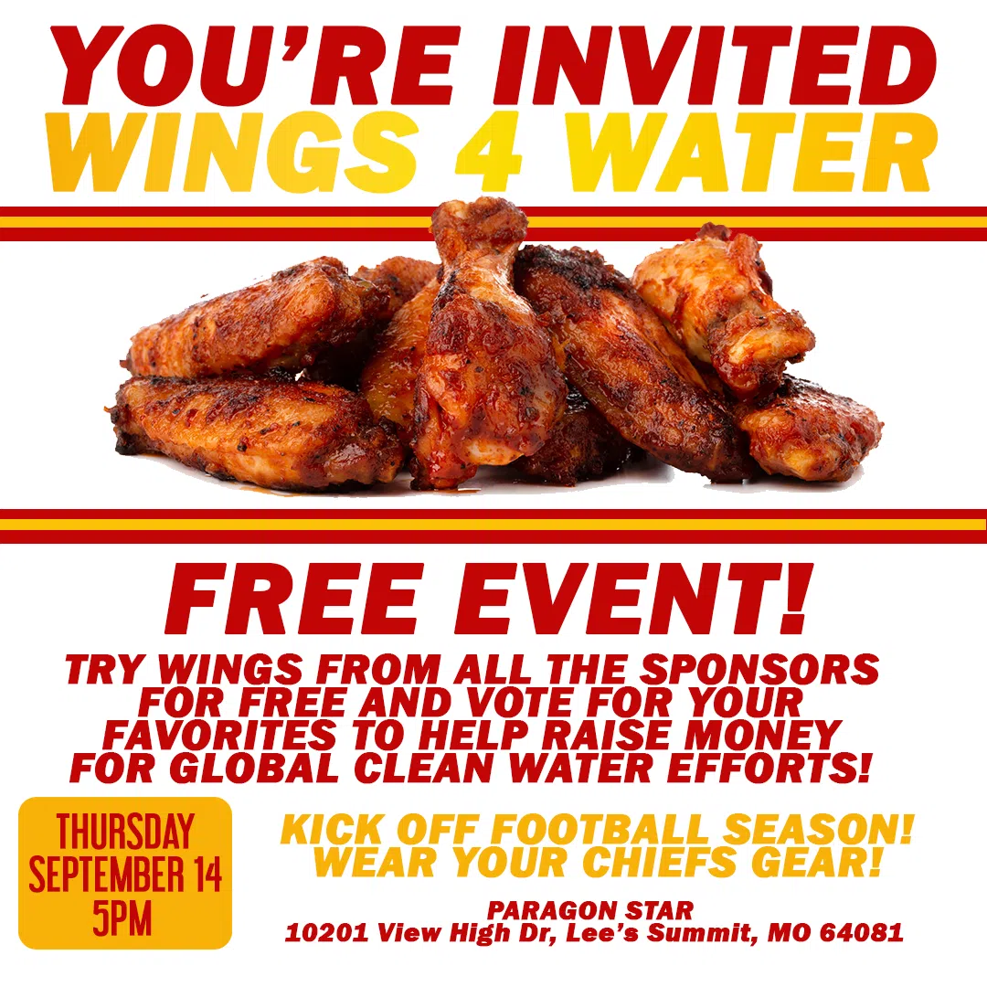 Guests come out for free and enjoy live music while eating a wing from as many sponsors as they want. Then, they vote for their favorite wings with money and 100% of the vote goes to global clean water efforts and local relief efforts.